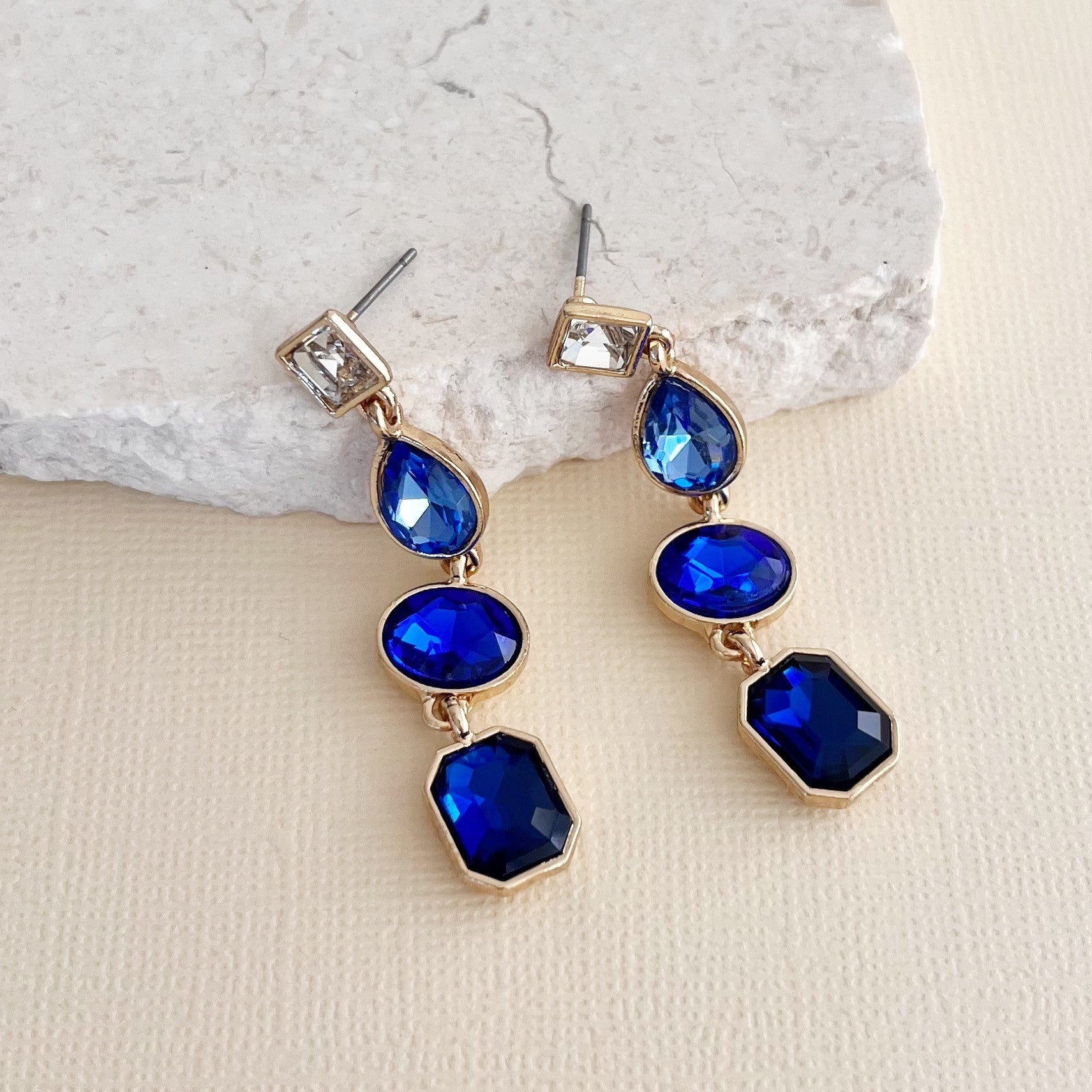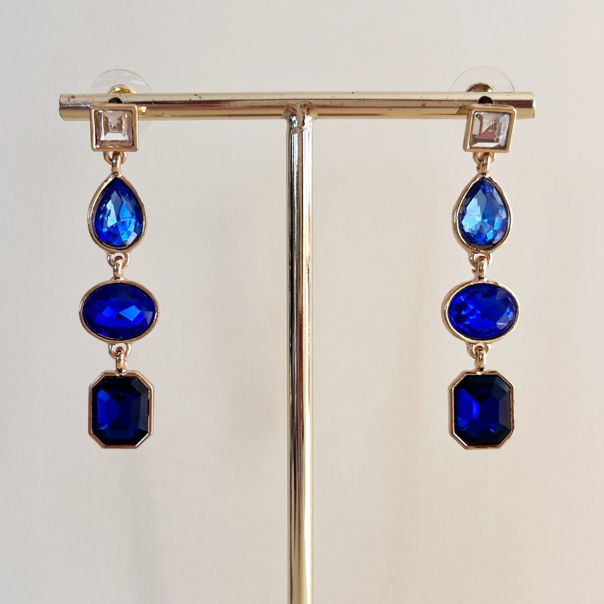 With a little vintage vibe these beauties are set in a gold coloured metal and feature different shaped stones of gradient shades of blue. Dainty and elegant.