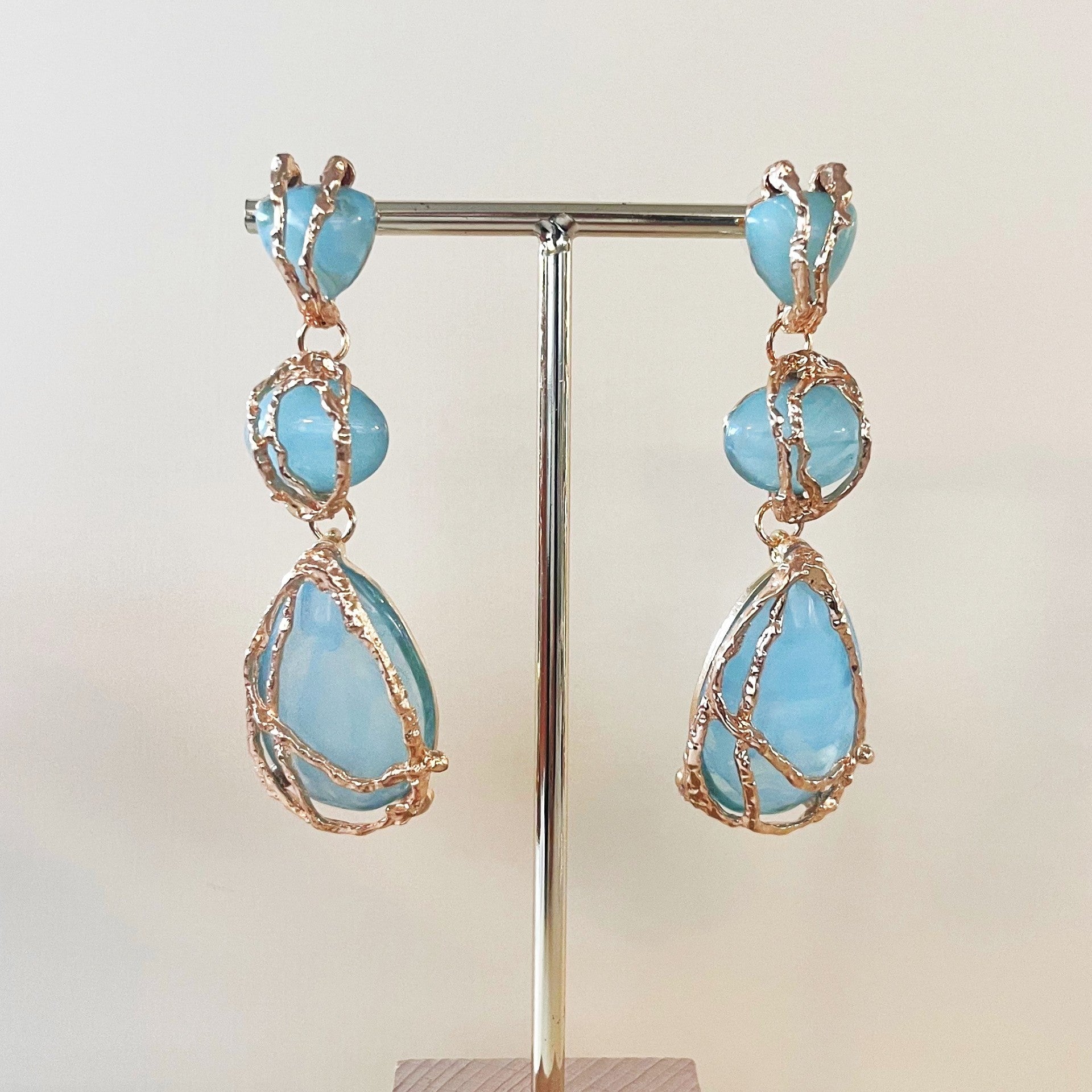 Make a dramatic statement with these incredible earrings! Crafted with three irregular shaped acrylic stones, finished with a stunning gold imitation rope woven across each piece.