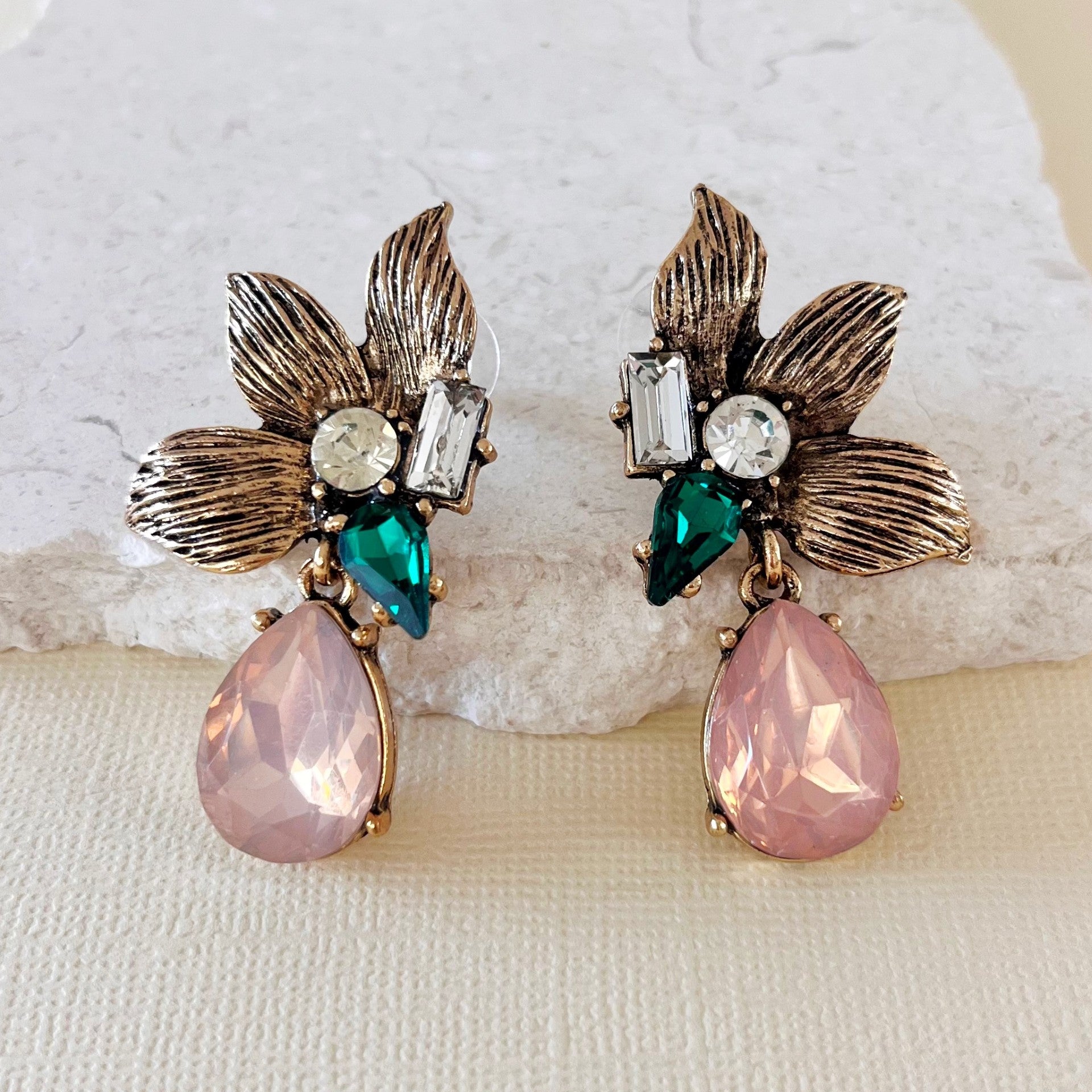 Elevate your style with the addition of our Clara Earrings. An elegant design with its dusty pink teardrop feature stone set amongst a distressed gold and diamanté flower stud, you'll have the perfect accessory to finish your spring/summer look.