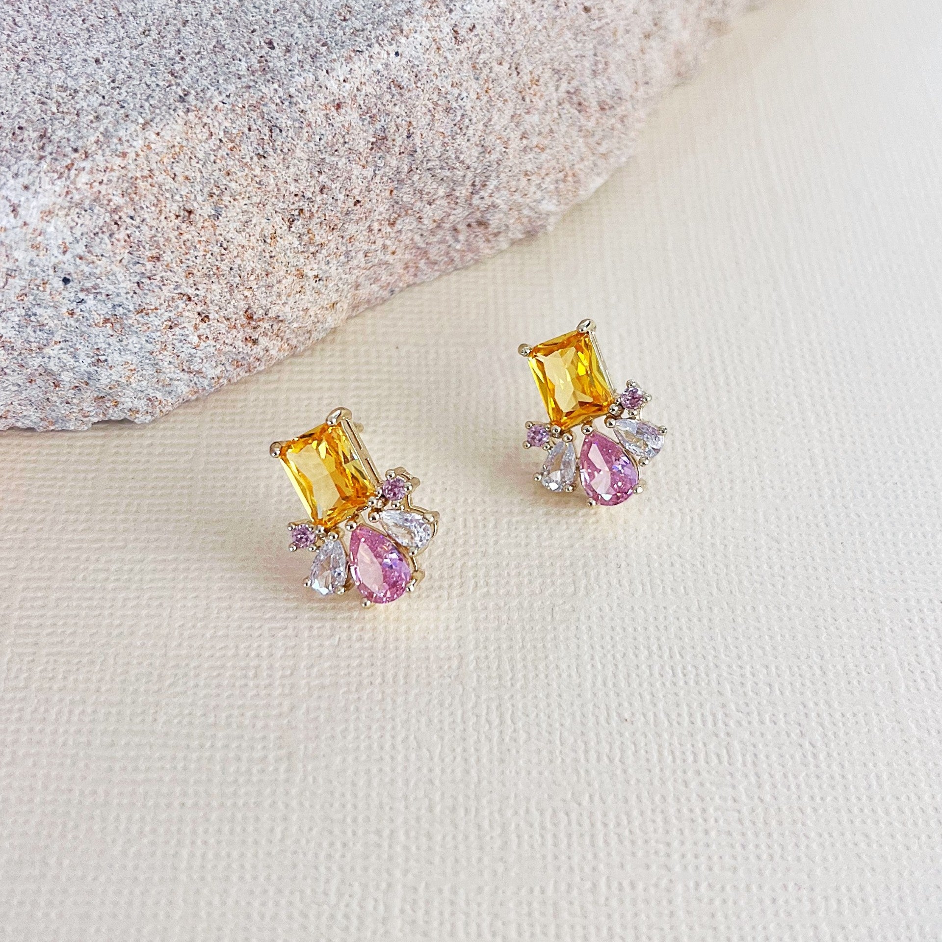 So pretty - Our Noa earrings feature a gorgeous yellow stone, complimented with a pink teardrop and diamonte accents.