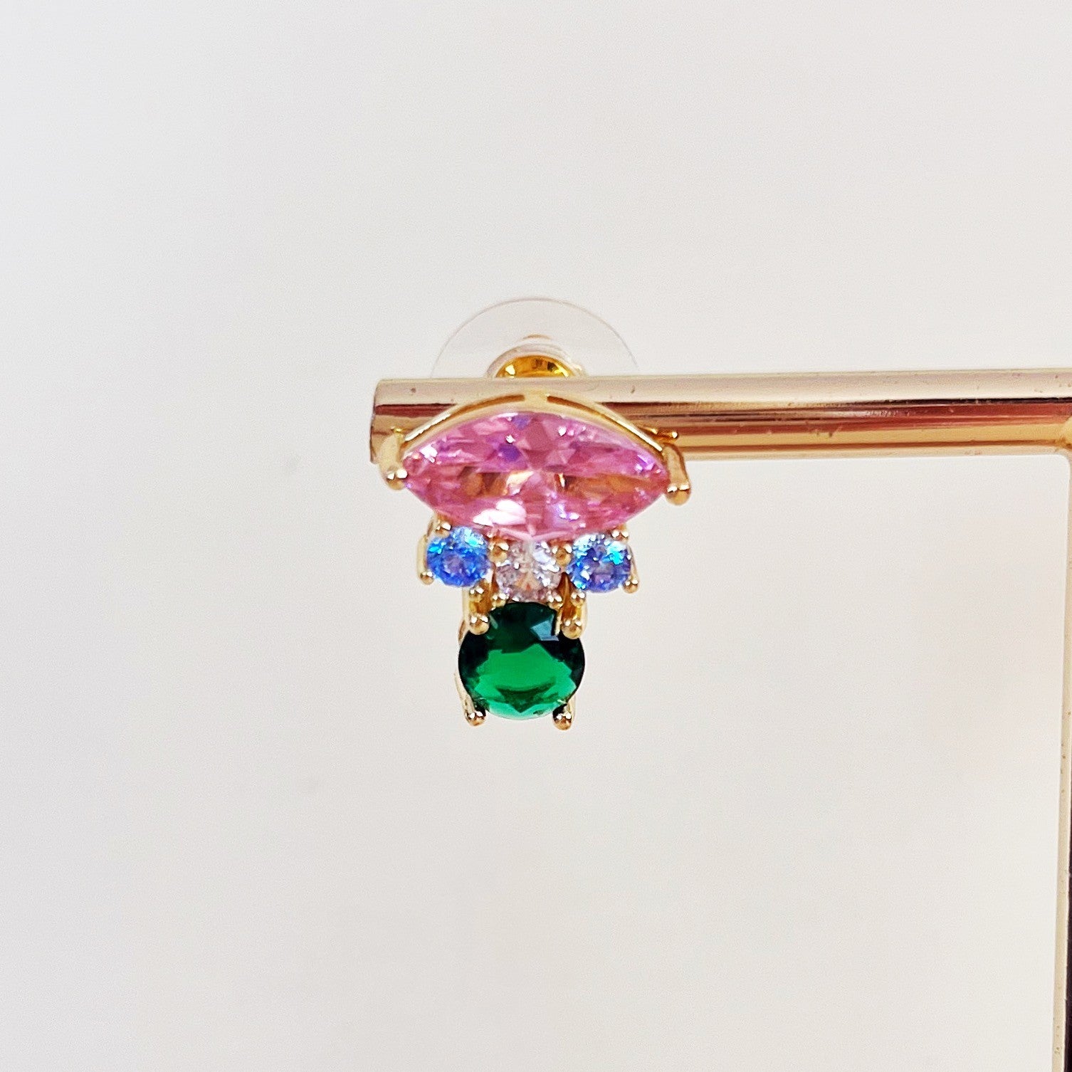 Edgy while also pretty - Our Merrit earrings feature a gorgeous pink marquise shaped stone, complimented with a round emerald green, pale blue and diamonte accents.
